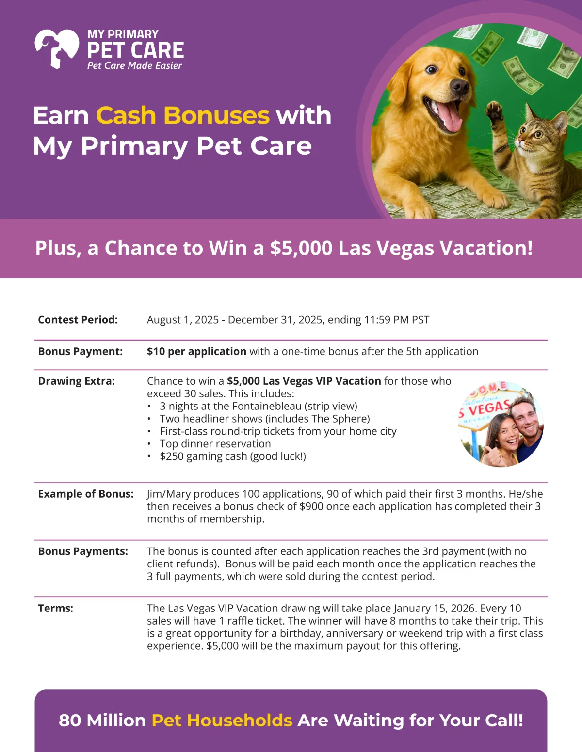 Commissions are paid monthly for all active memberships, with no chargebacks tied to vet visits or usage.